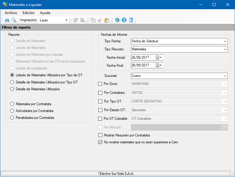 Este módulo permite generar reprotes de los materiales a liquidar.