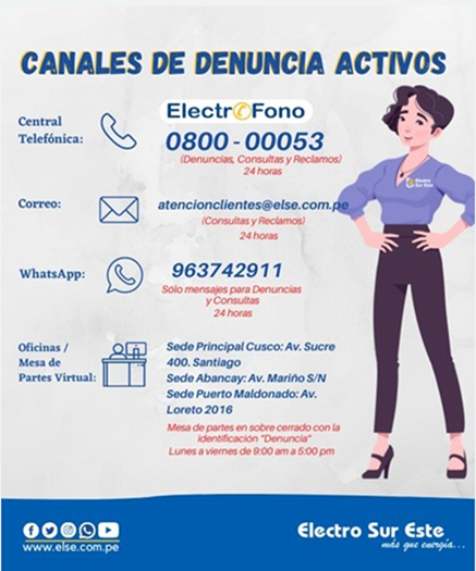 ¡Bienvenido(a) al Canal de Denuncias e Integridad de Electro Sur Este S.A.A. (ELSE)! Electro Sur Este S.A.A. pone a disposición este Canal de Denuncias como parte de su compromiso con la ética, la integridad, la transparencia y la prevención de actos contrarios a sus valores institucionales, así como al cumplimiento de la normativa vigente. |