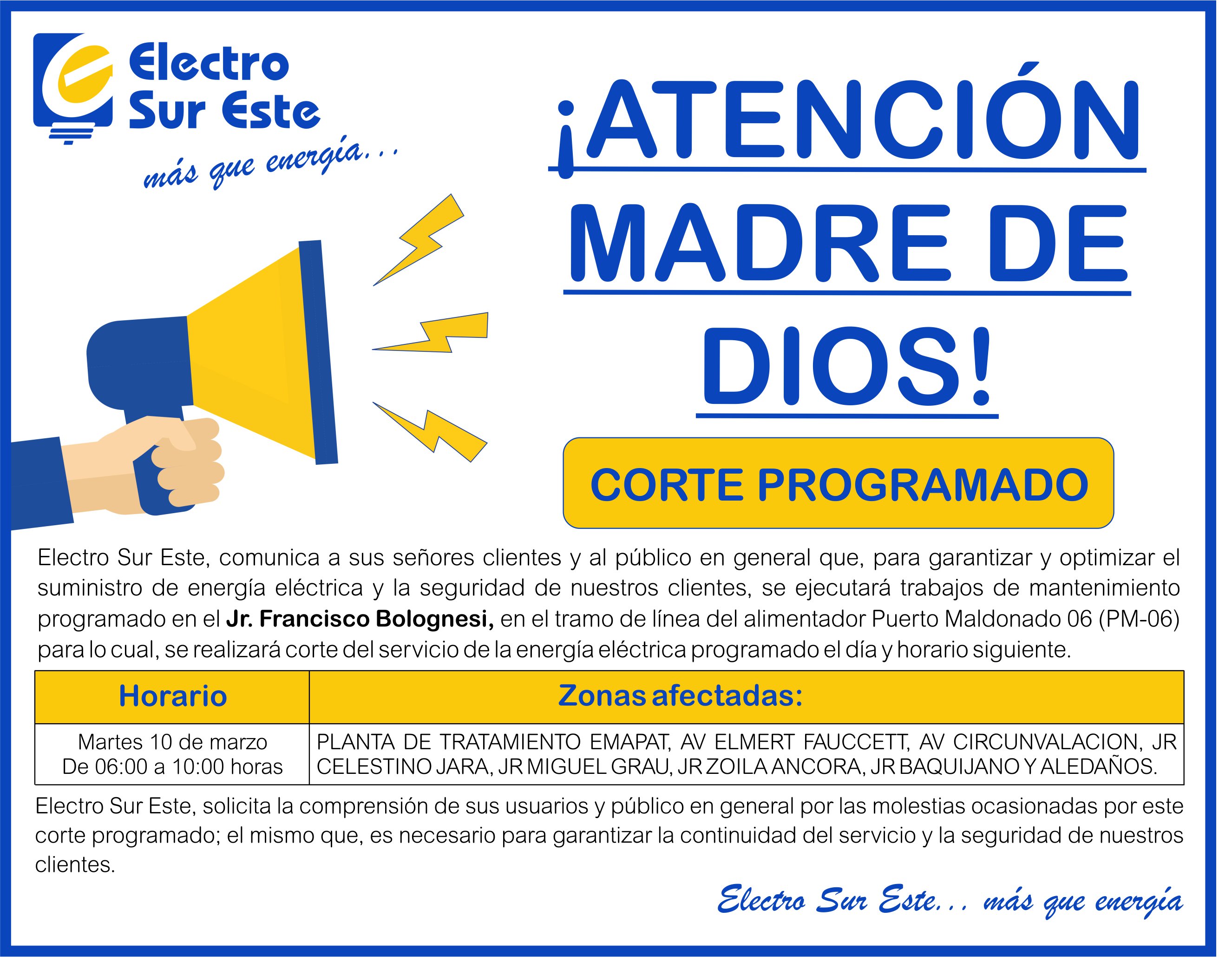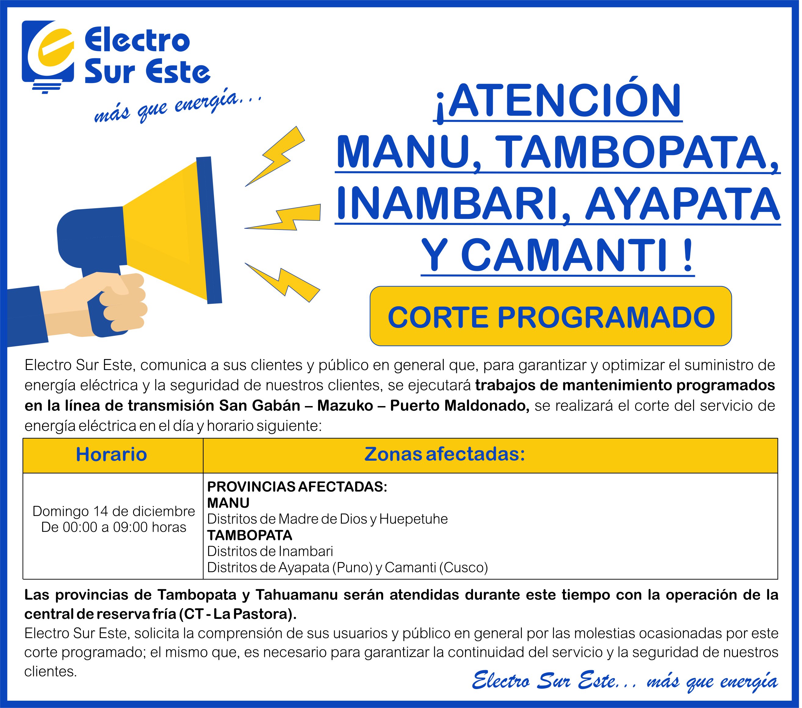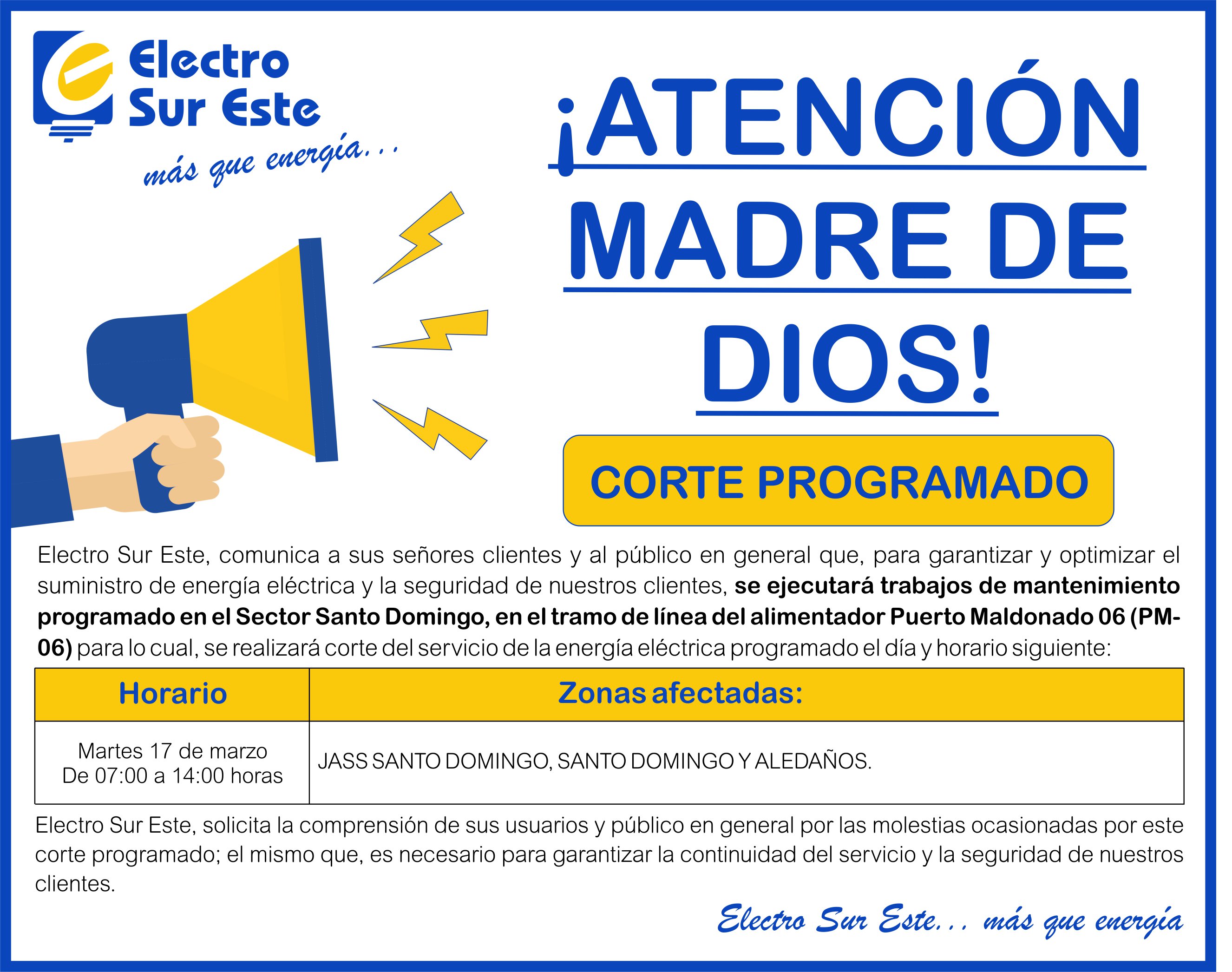 Electro Sur Este S.A.A., comunica a sus señores clientes y al público en general, que para realizar trabajos de expansión, reforzamiento y renovación de las instalaciones eléctricas, se suspenderá el servicio eléctrico en los lugares, días y horarios siguientes.