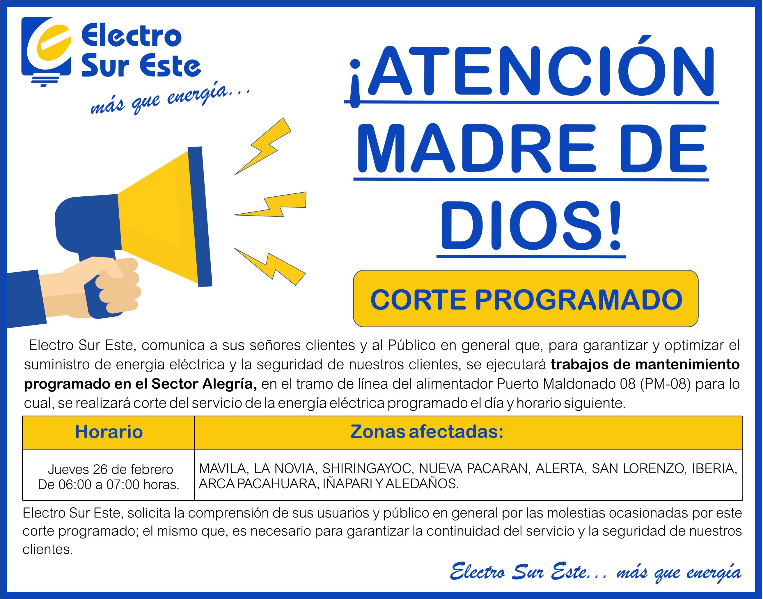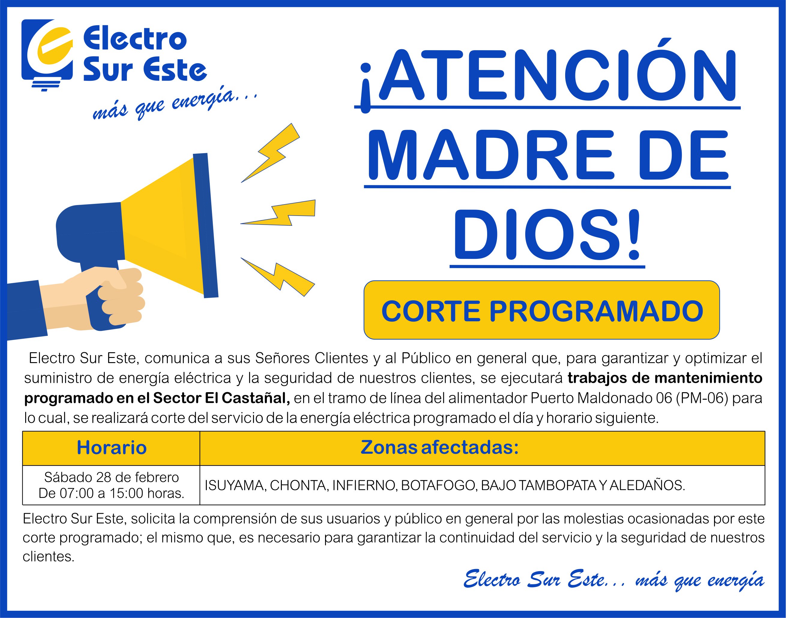 Electro Sur Este S.A.A., comunica a sus señores clientes y al público en general, que para realizar trabajos de expansión, reforzamiento y renovación de las instalaciones eléctricas, se suspenderá el servicio eléctrico en los lugares, días y horarios siguientes.