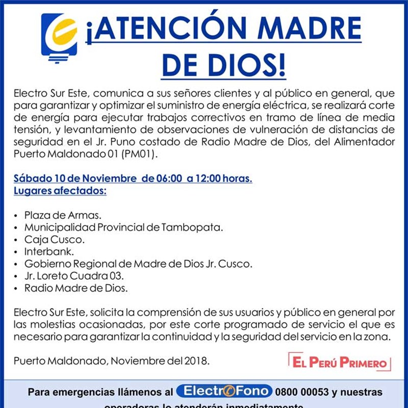 COMUNICADO DE CORTE DE ENERGIA DEL 10 DE NOVIEMBRE - MADRE DE DIOS