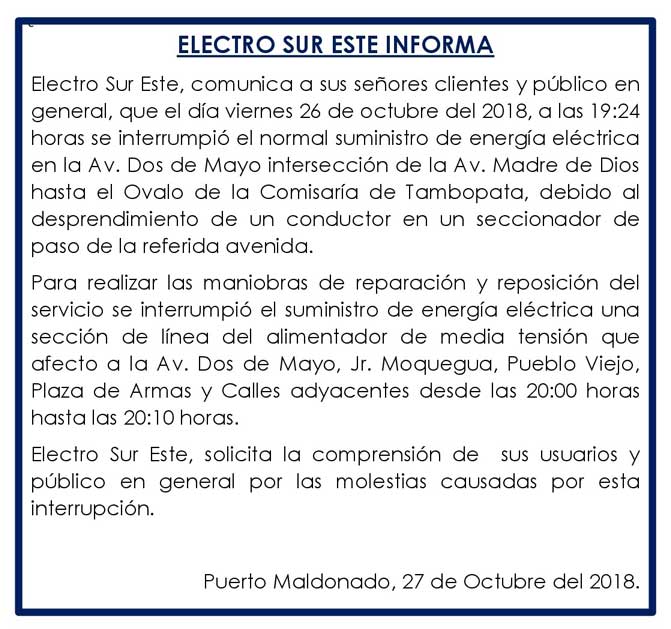 COMUNICADO DE CORTE INTEMPESTIVO DE ENERGIA 26 DE OCTUBRE - PUERTO MALDONADO
