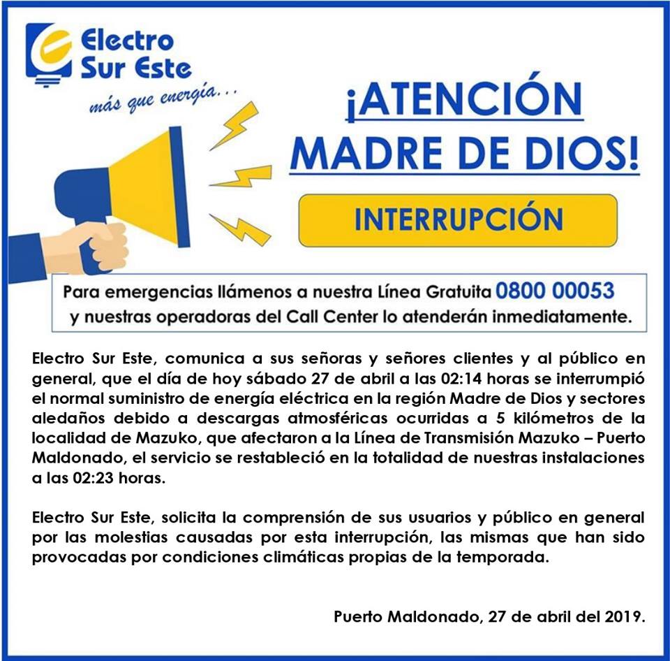 COMUNICADO DE CORTE INTEMPESTIVO DE ENERGIA 27 DE ABRIL - MADRE DE DIOS