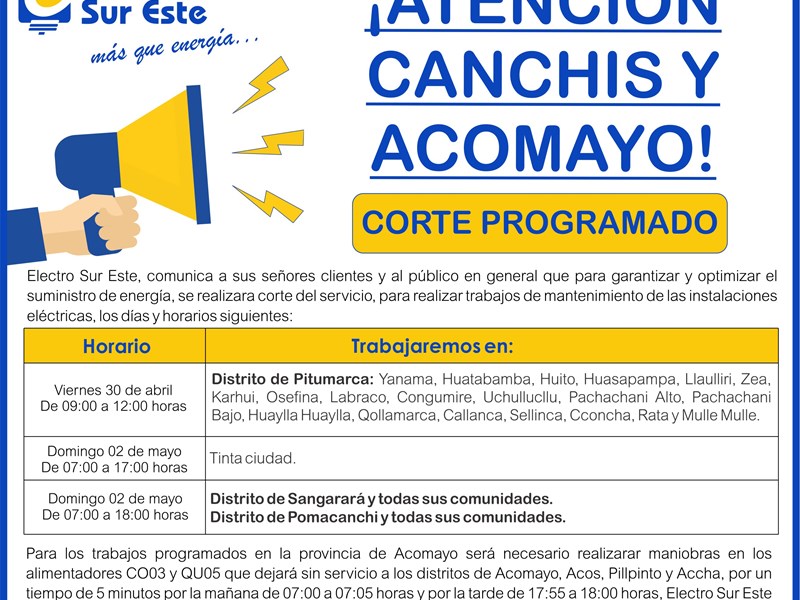 COMUNICADO - CORTE PROGRAMADO DÍAS 30 DE ABRIL Y 02 DE MAYO - CANCHIS Y ACOMAYO