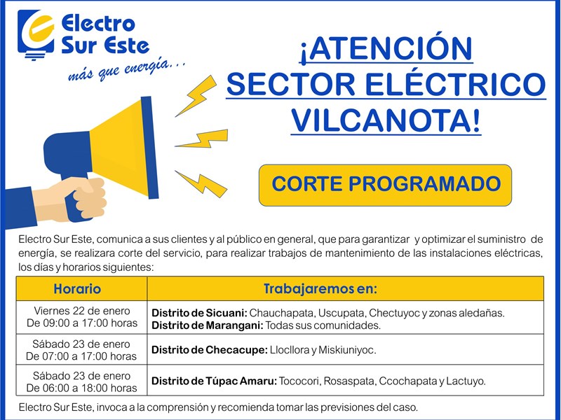 COMUNICADO - CORTE PROGRAMADO DÍAS 22 Y 23 DE ENERO - SECTOR ELÉCTRICO VILCANOTA