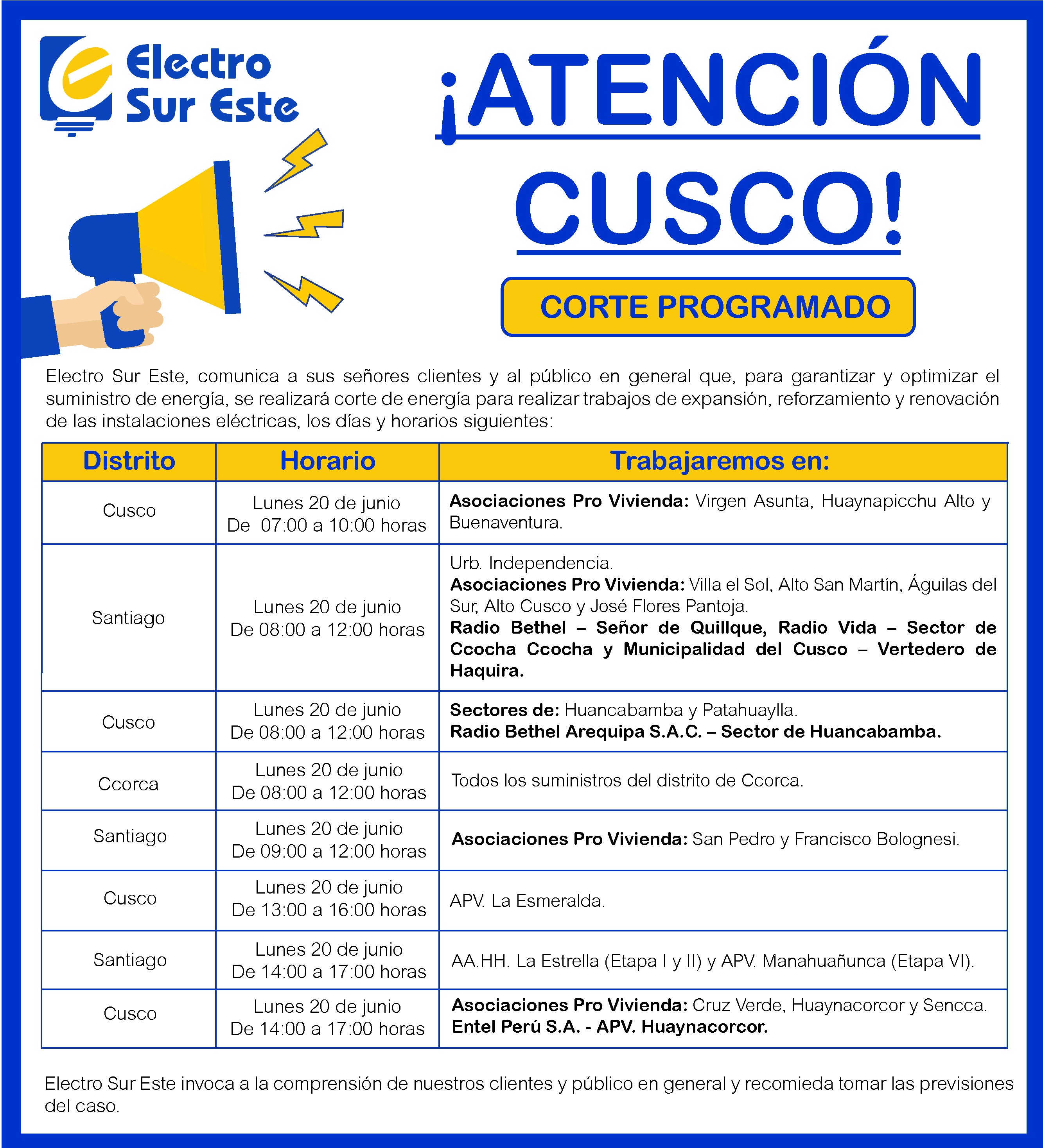 COMUNICADO - CORTE PROGRAMADO DÍA LUNES 20 DE JUNIO - CUSCO
