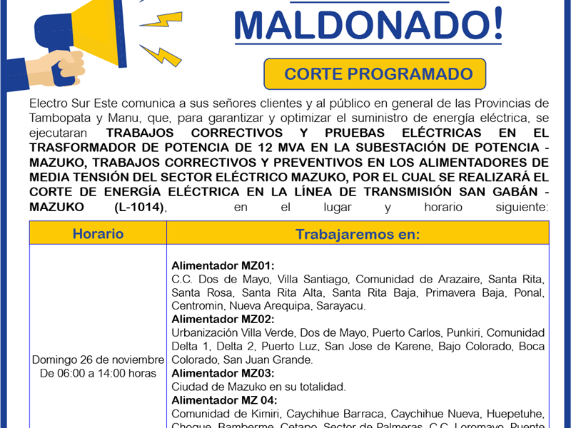 COMUNICADO - CORTE PROGRAMADO DÍA DOMINGO 26 DE NOVIEMBRE- PUERTO MALDONADO