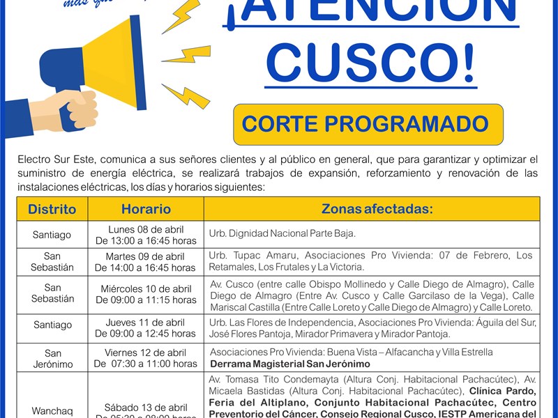 COMUNICADO - CORTE PROGRAMADO DEL 08 AL 13 DE ABRIL - CUSCO
