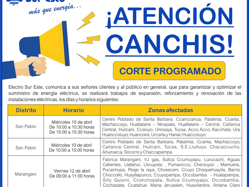 COMUNICADO - CORTE PROGRAMADO DÍAS 10 Y 12 DE ABRIL - CANCHIS