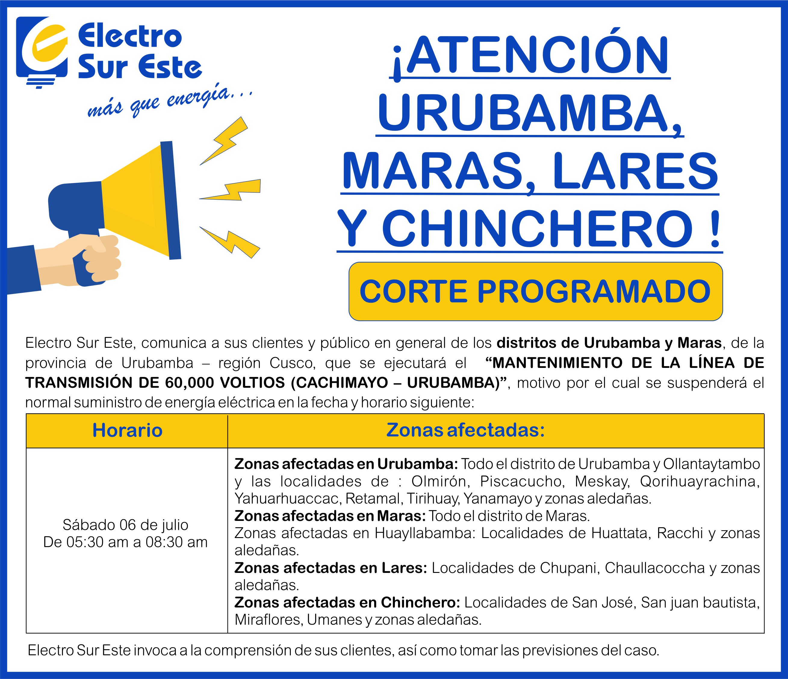 COMUNICADO - CORTE PROGRAMADO DÍA SÁBADO 06 DE JULIO - URUBAMBA, MARAS, LARES Y CHINCHERO