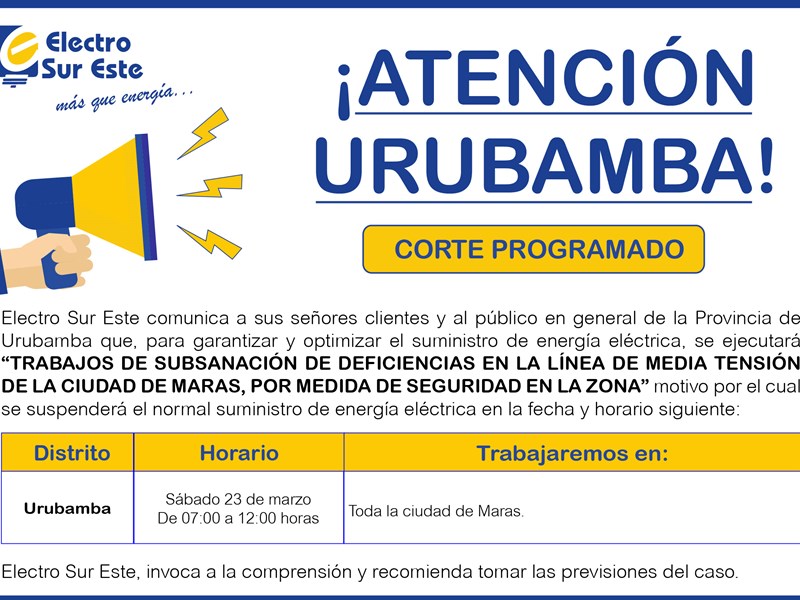 COMUNICADO - CORTE PROGRAMADO DÍA SÁBADO 23 DE MARZO - URUBAMBA