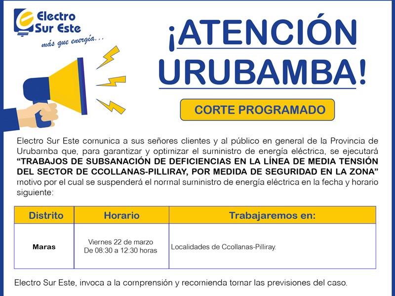 COMUNICADO - CORTE PROGRAMADO DÍA VIERNES 22 DE MARZO - URUBAMBA