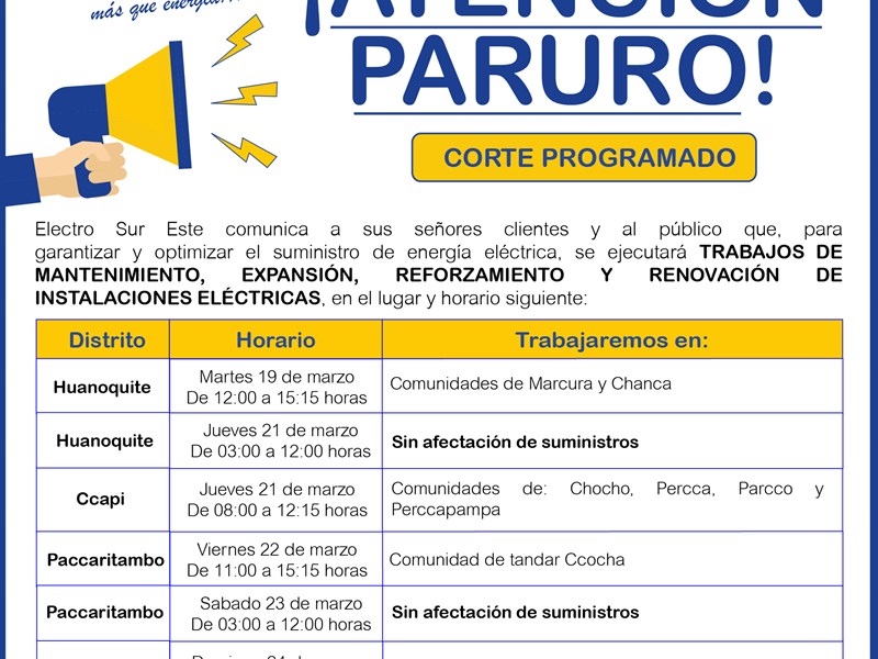 COMUNICADO - CORTE PROGRAMADO DÍAS 19, 21, 22, 23 Y 24 DE MARZO - PARURO