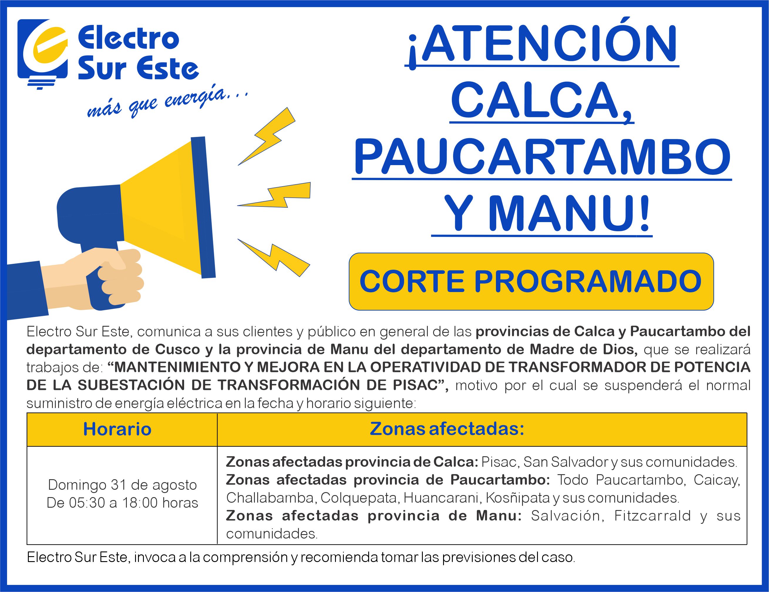COMUNICADO - CORTE PROGRAMADO DÍA DOMINGO 31 DE AGOSTO - CALCA, PAUCARTAMBO Y MANU