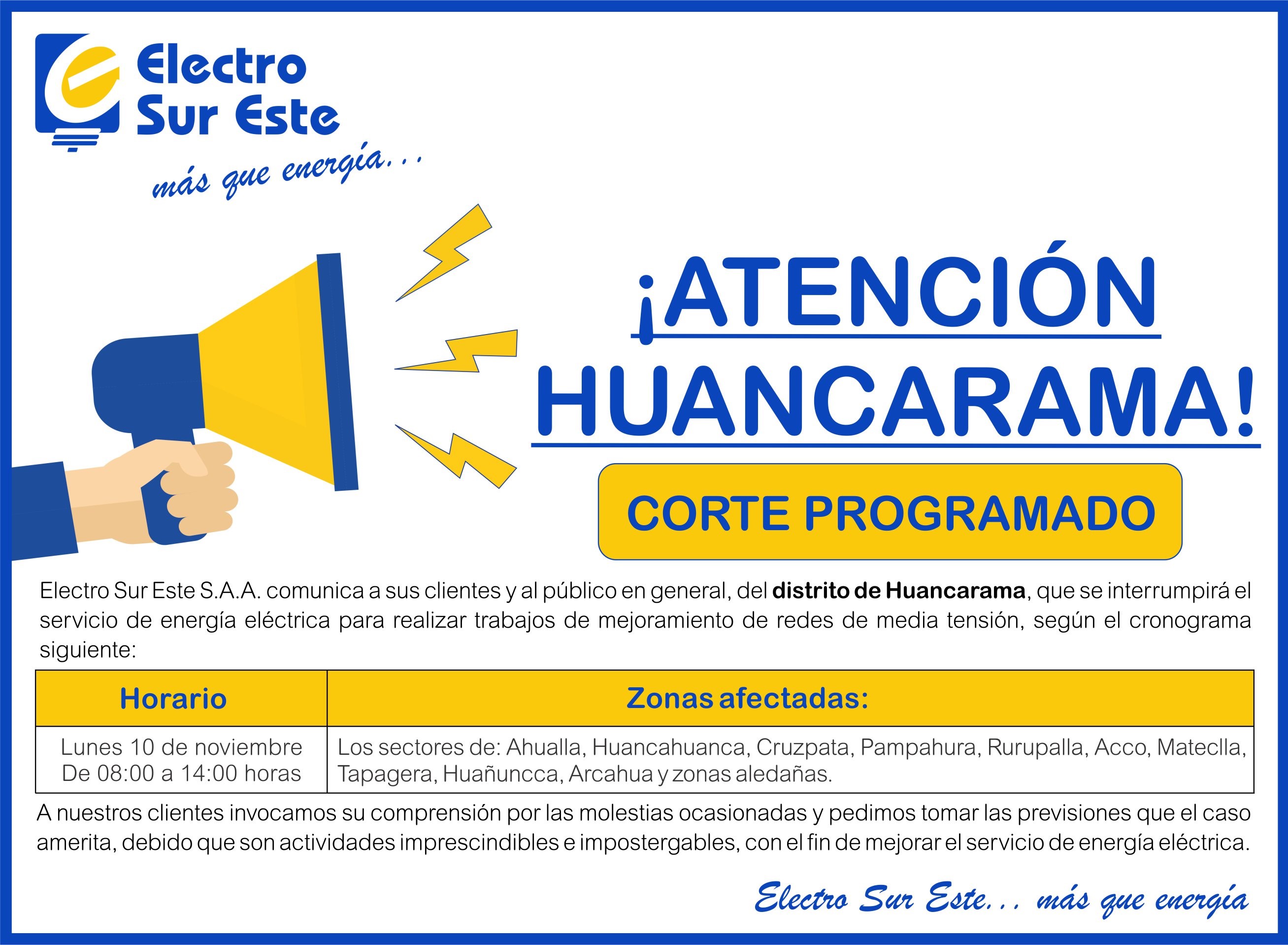 COMUNICADO - CORTE PROGRAMADO DÍA LUNES 10 DE NOVIEMBRE - HUANCARAMA
