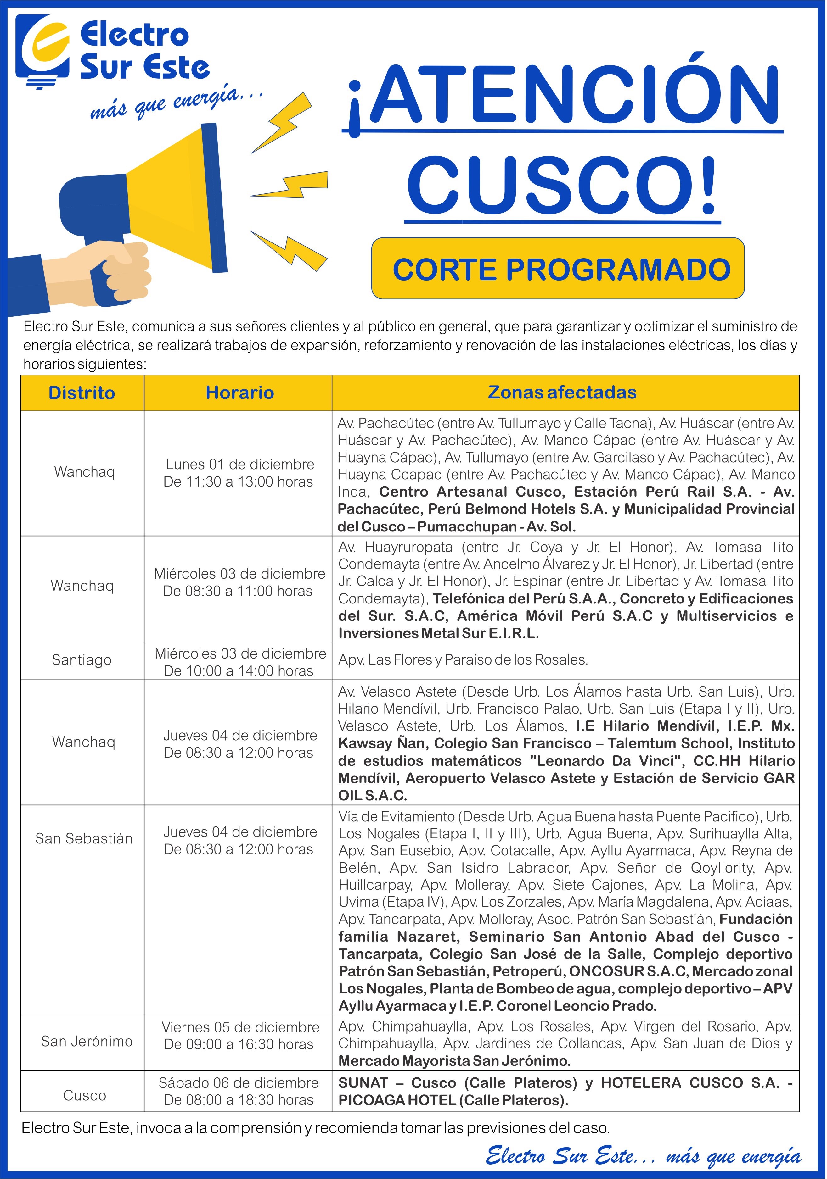 COMUNICADO - CORTE PROGRAMADO DEL 01 AL 06 DE DICIEMBRE - CUSCO