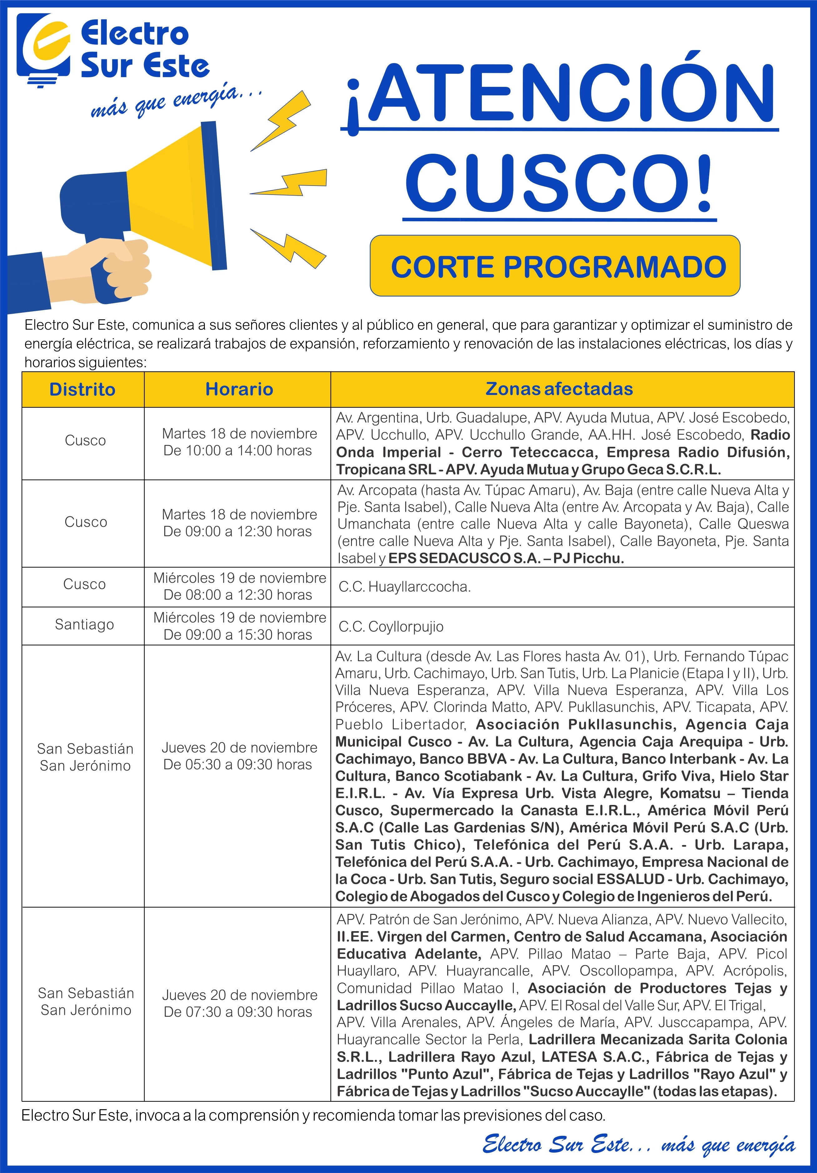 COMUNICADO - CORTE PROGRAMADO DEL 18 AL 20 DE NOVIEMBRE - CUSCO