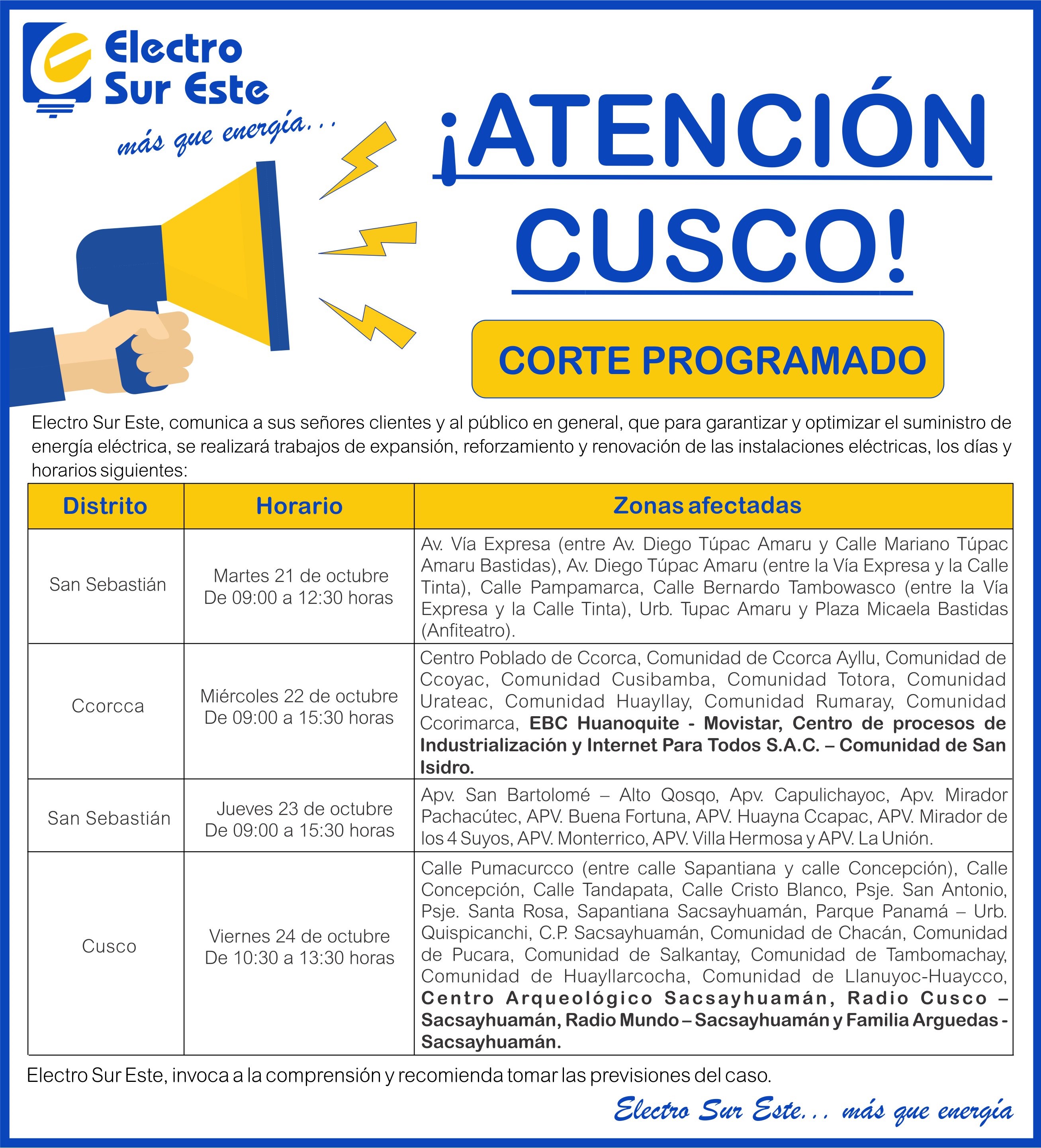 COMUNICADO - CORTE PROGRAMADO DEL 21 AL 24 DE OCTUBRE - CUSCO
