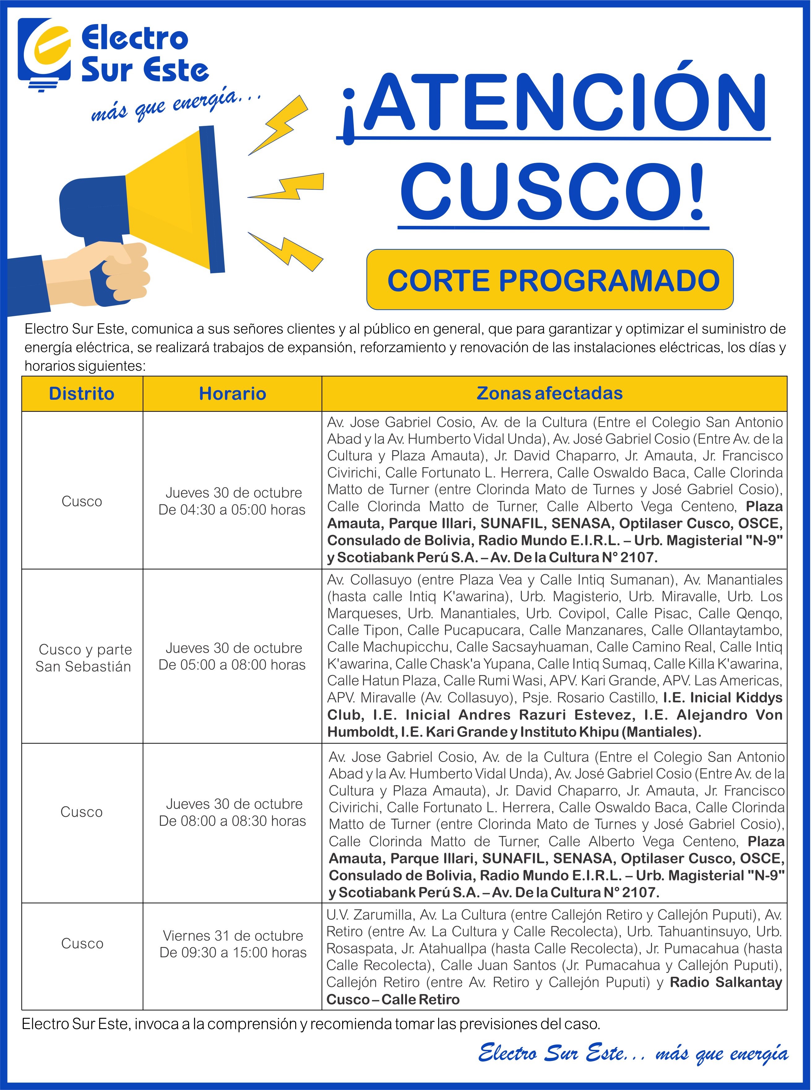 COMUNICADO - CORTE PROGRAMADO DEL 30 AL 31 DE OCTUBRE - CUSCO