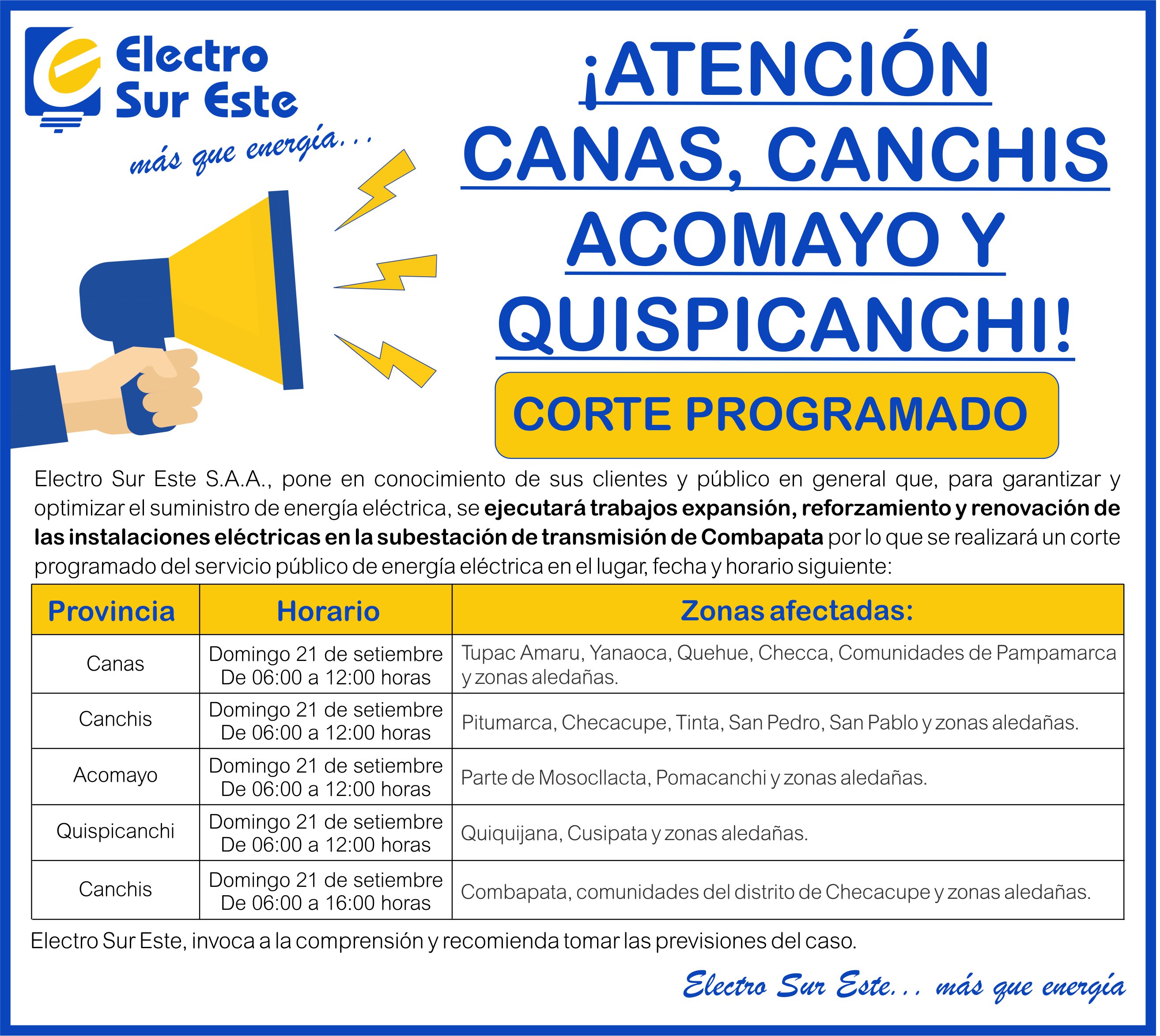 COMUNICADO - CORTE PROGRAMADO DÍA DOMINGO 21 DE SETIEMBRE - CANAS, CANCHIS, ACOMAYO Y QUISPICANCHI