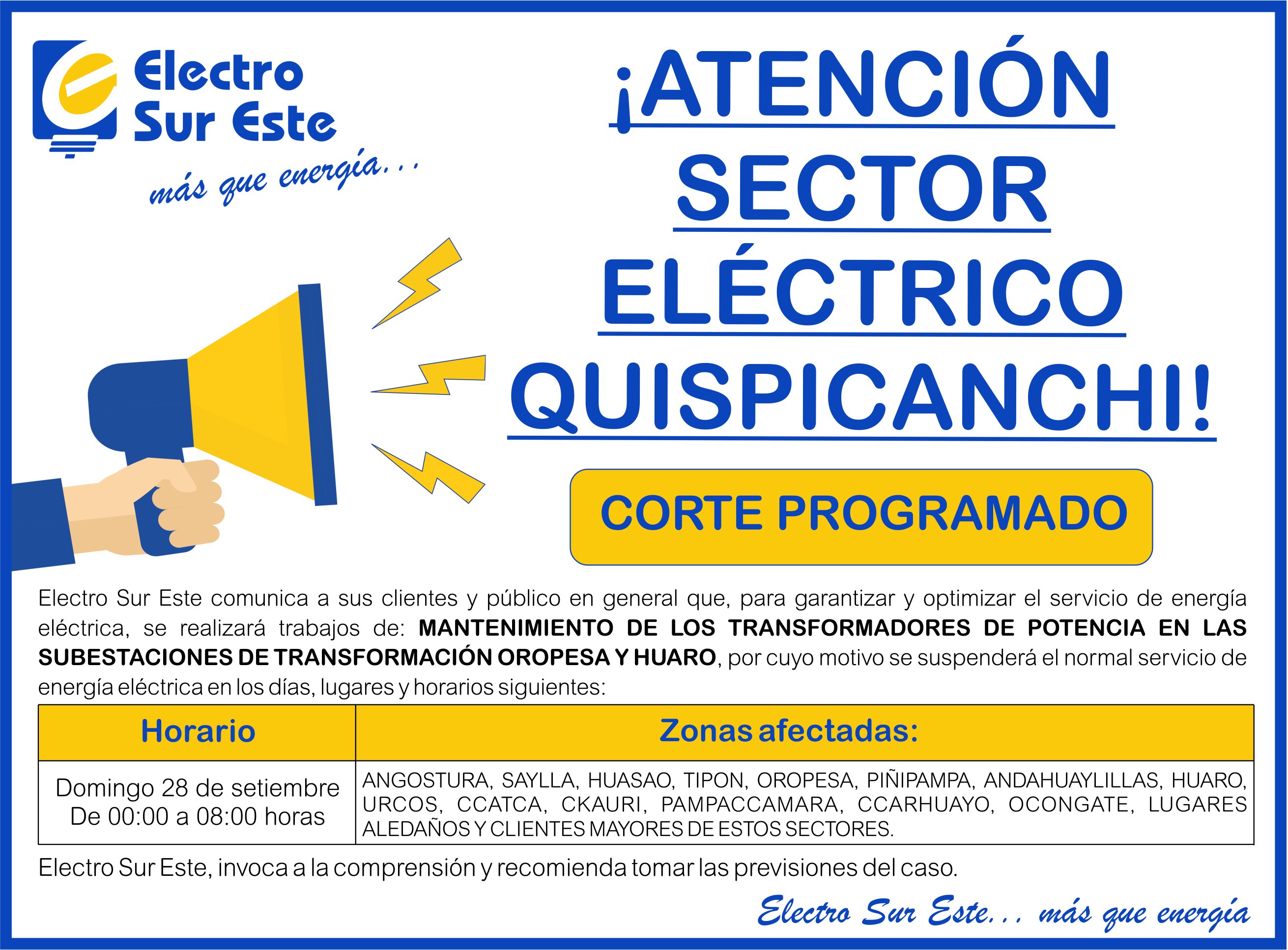 COMUNICADO - CORTE PROGRAMADO DÍA DOMINGO 28 DE SETIEMBRE - QUISPICANCHI