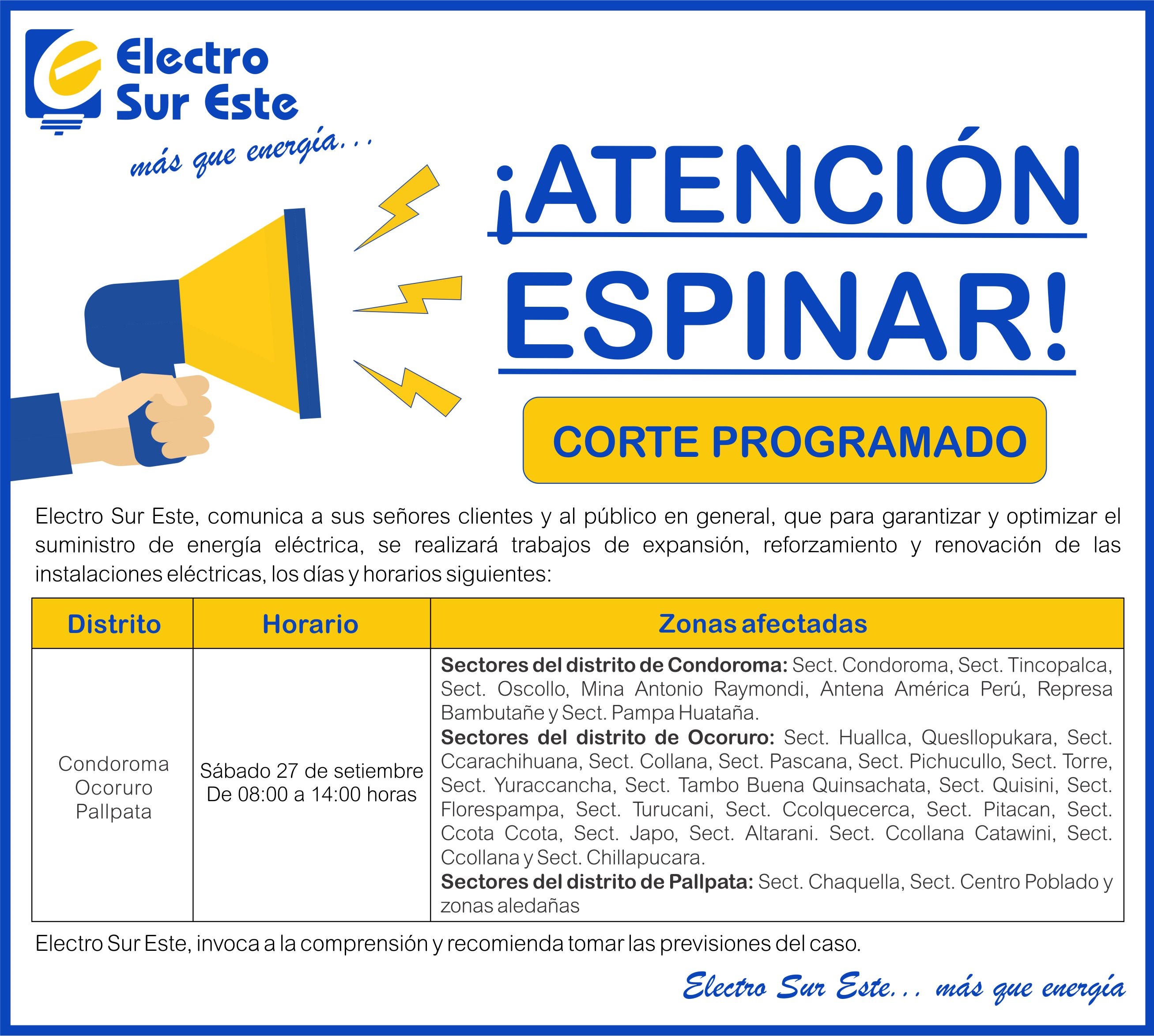 COMUNICADO - CORTE PROGRAMADO DÍA SÁBADO 27 DE SETIEMBRE - ESPINAR