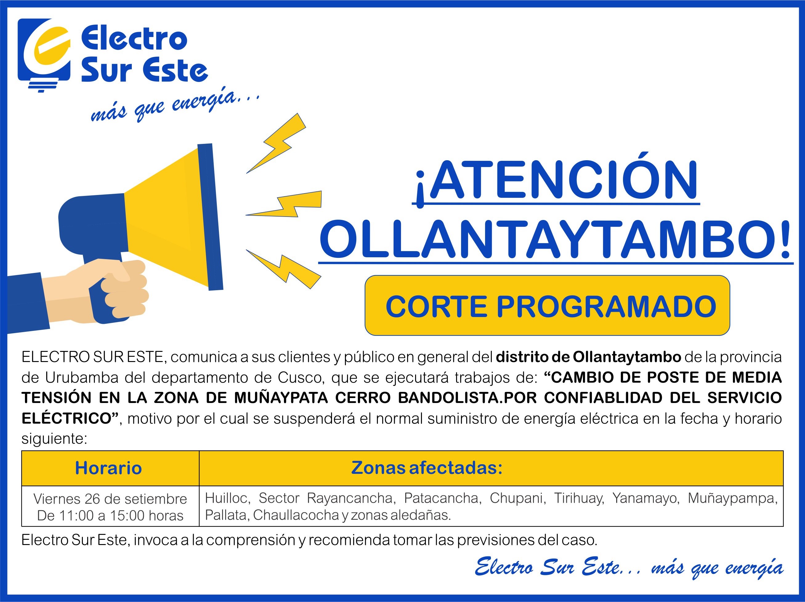 COMUNICADO - CORTE PROGRAMADO DÍA VIERNES 26 DE SETIEMBRE - OLLANTAYTAMBO