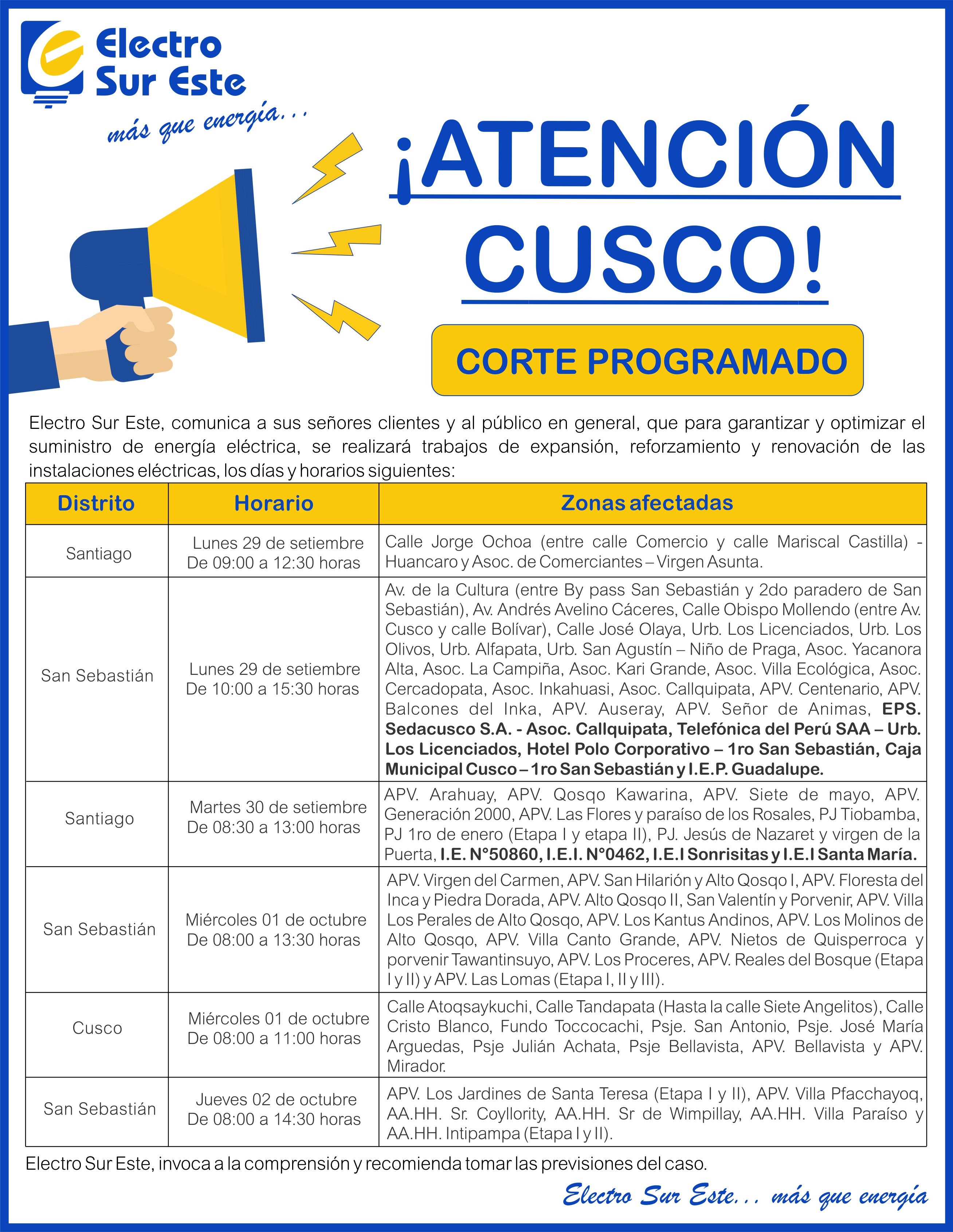 COMUNICADO - CORTE PROGRAMADO DEL 29 DE SETIEMBRE AL 02 DE OCTUBRE - CUSCO